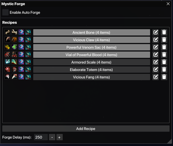 ProcessingBulk auto-crafting for the Mystic Forge. Set up recipes once and let it craft hundreds hands-free while you do other things or multibox. Skips the default GW2 Mystic Forge UI entirely.